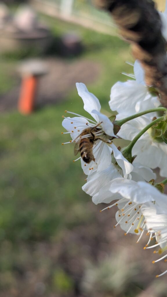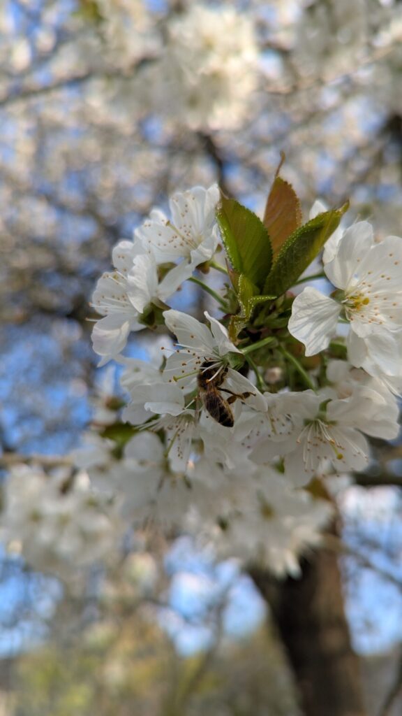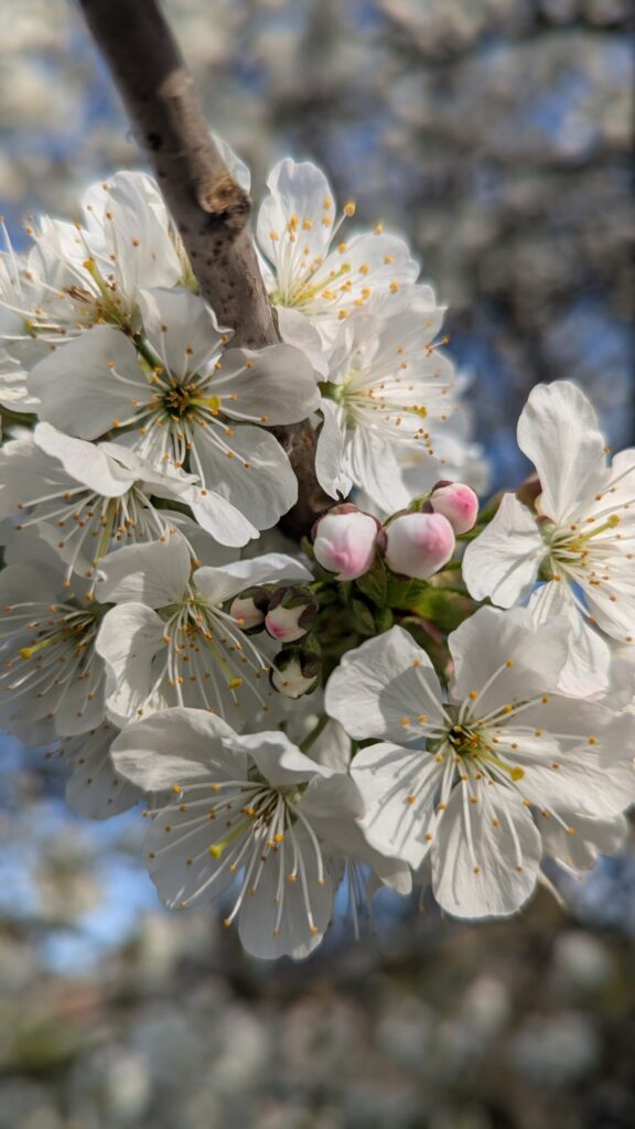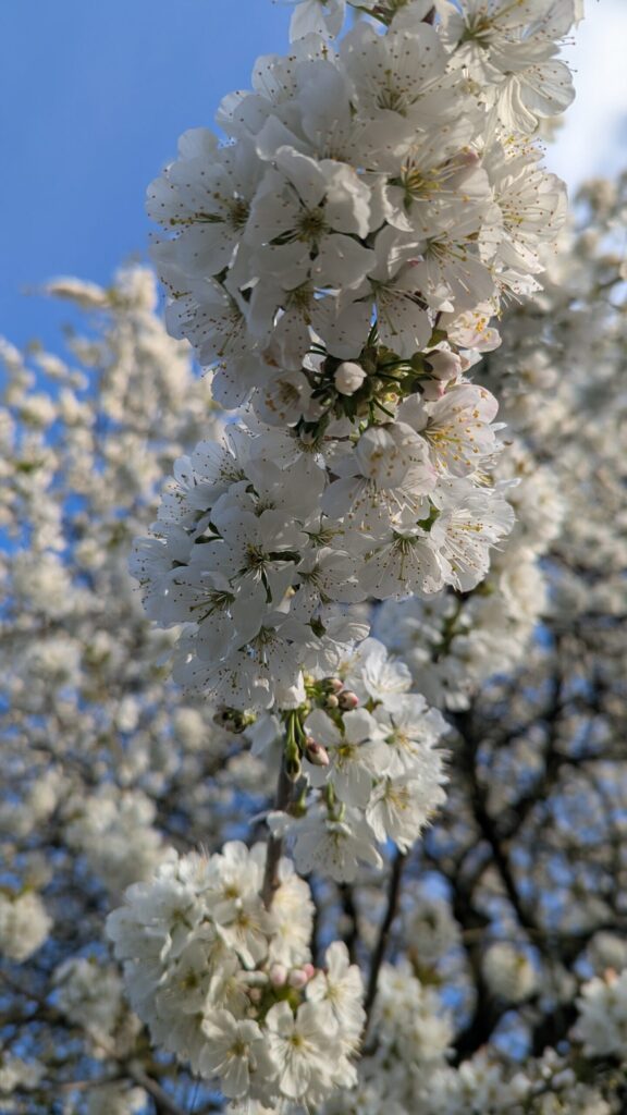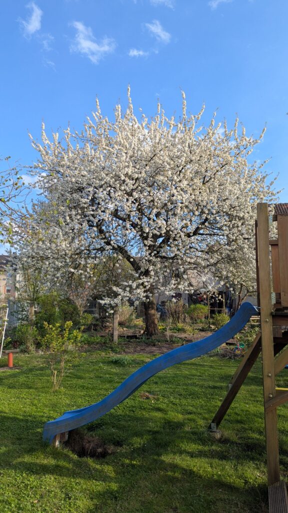 Die Kirsche in unserem Garten steht in voller Blüte. Jedes Jahr aufs neue kann ich mich daran nicht satt sehen.. Meine Ma wollte sie immer verschneiden. Ich hab mal gelesen, wenn man einmal damit anfängt, muss man immer wieder schneiden. Kein Bedarf.. sie schimpft immer über die Stare, die oben die Kirschen wegfuttern.